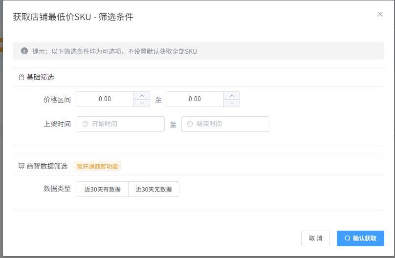 先”获取全店spu里的最低价sku” 根据店铺情况去筛选,如果需要全店开车 就直接下一步