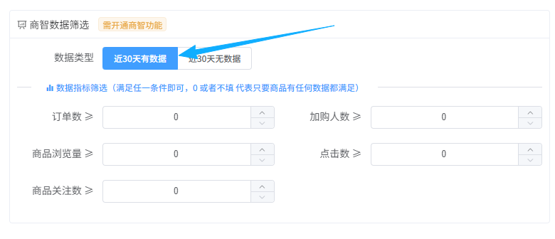如果需要针对有数据产品 和 无流量产品分开投放,可以根据下方筛选获取对应商品